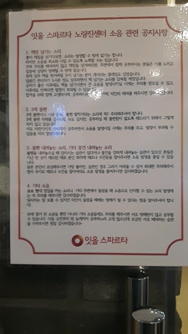 -10분의 쉬는시간 후에 교실 못 들어가면 교실 밖에서 공부해야 함. 3색 볼펜 비허용(소음 때문에) 대기 때문에 1달 대기하다 겨우 등록함ㅡㅡ. 점심 신청하면 안에서 먹을 수 있음. 감시카메라가 달려 있어 자면 직원이 깨우러 옴. 접수 담당자 매우 불친절. 불쾌했음.